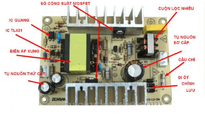 Nhìn vào board mạch trên các bạn thấy rằng một bo nguồn xung sẽ bao gồm những linh kiện cơ bản sau: